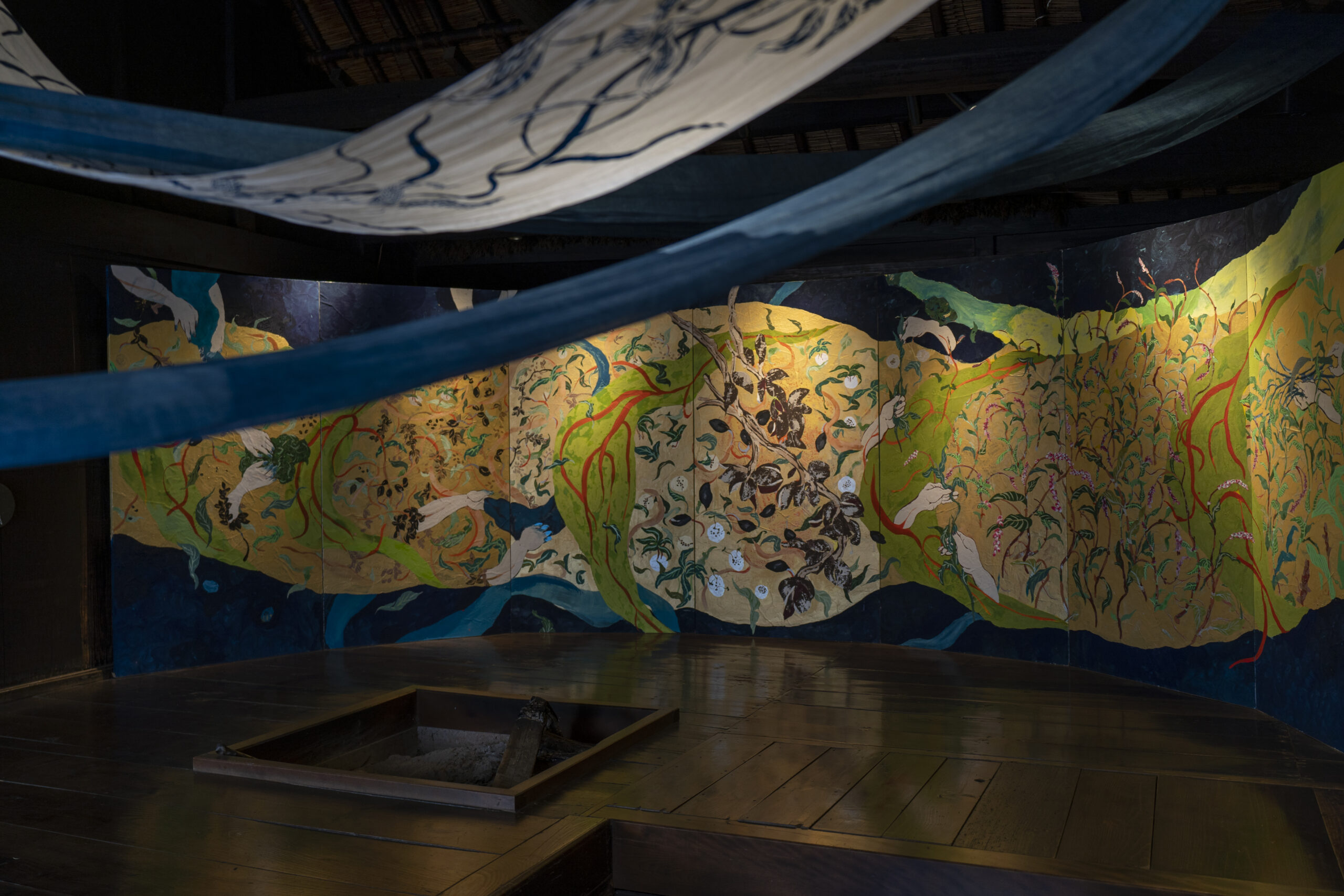 浅野友理子《藍の緒》2023年 油彩・岩絵具・水干絵具、和紙 176.5×760cm