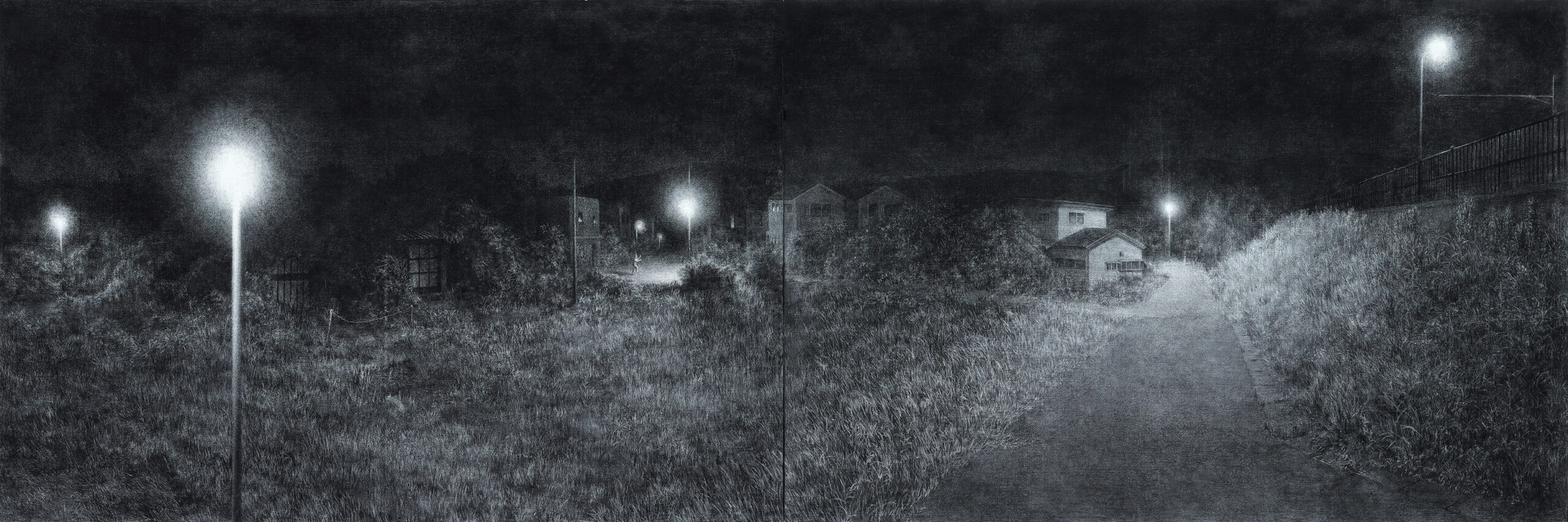 1993年愛知県生まれ。愛知県立芸術大学大学院修了。語られにくい過疎地や住宅街などを訪れ、主に夜の風景を木炭で描く。その地で盆踊りを踊り、場所が孕む記憶を身体的に捉えながら、人の営みの痕跡を探求する。忘れ去られた場所を「供養」しつつ、匿名化していく制作スタイルと、深い精神性を湛えたモノクロームの表現で、風景画の新たな可能性を提示する。「VOCA展2024」VOCA賞など受賞。主な展覧会に「TOKAS-Emerging 2023」(トーキョーアーツアンドスペース、2023年)、「第18回shiseido art egg 大東忍『不寝の夜』 」(資生堂ギャラリー、東京、2025年)、「路体」(ギャラリーサンセリテ、愛知、2025年)など。